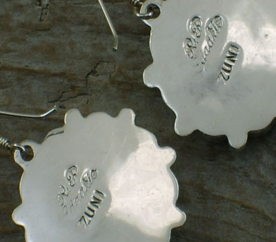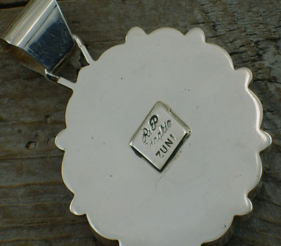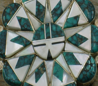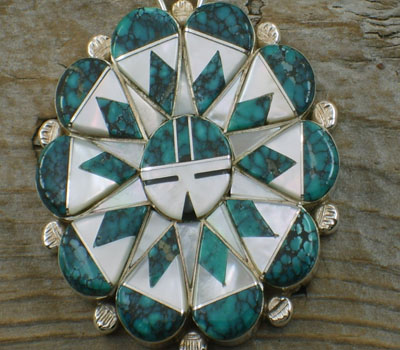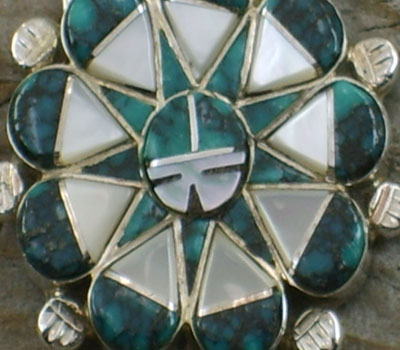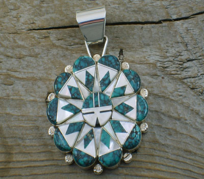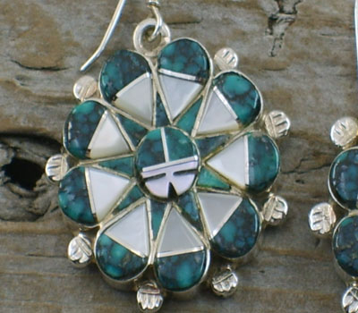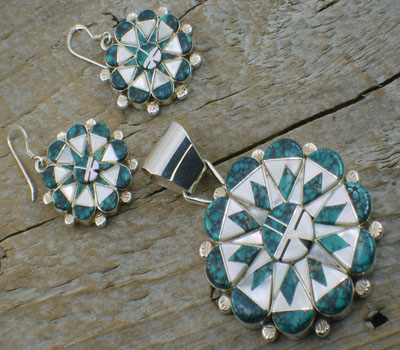 This is a Zuni made pendant, with matching earring set, having an exquisite design pattern, using turquoise and mother of pearl. The pendant is a sizeable piece with a generous bale-opening which will allow it to slide onto a thick chain or even a gemstone necklace. The earrings will complete a stunning look when worn with the pendant or offer simple elegance worn alone.