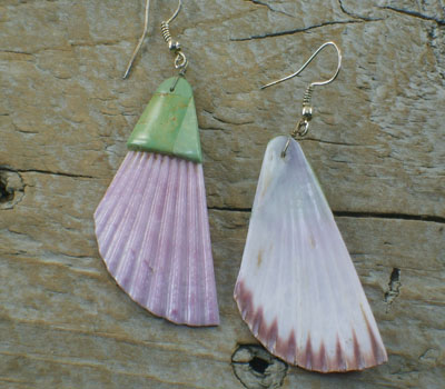 Native American lilac purple shell Earrings having nice defined grooves is used used as the palette for sea green turquoise inlay. Santo Domingo Indian made by artist Walter Garcia and Ella Mae. Large perfect for those who love purple.