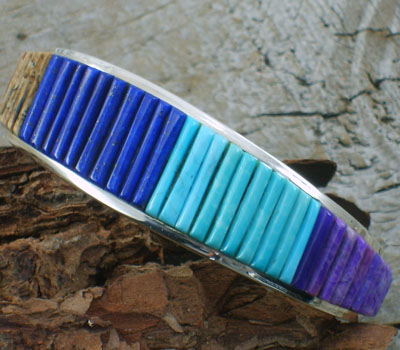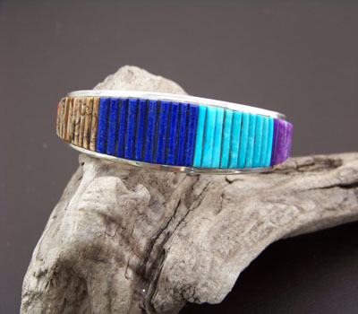 Unique American Indian made cuff having six individual sections of channel set stones; including red coral, picasso marble, lapis lazuli, turquiose, purple spiney oyster and lab opal. Truly a stunning and rare design destined to receive compliments every time worn. Stamped sterling and hallmarked AP.