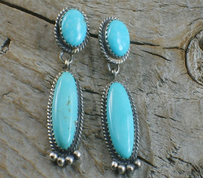 All turquoise stones presented here have a uniform aqua color which is true beauty. They are, indeed, "robin's egg" blue and are an excellent example of the turquoise gemstone. A lovely oval / long oval duet. You'll enjoy these. American Indian made.