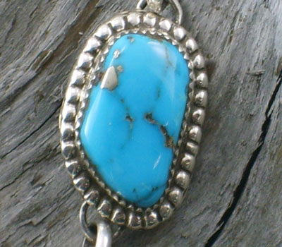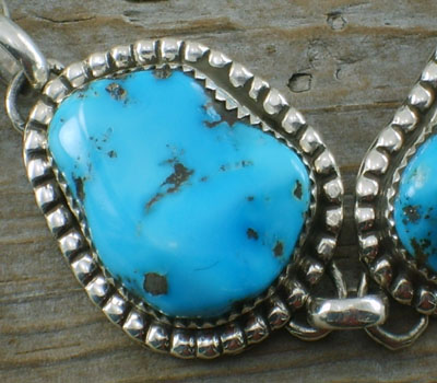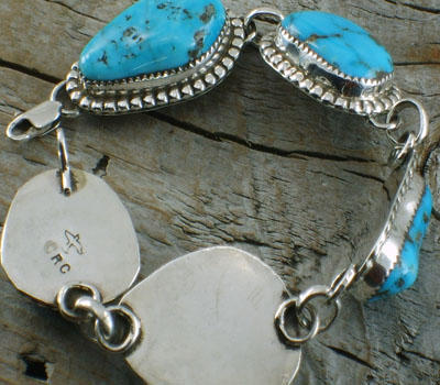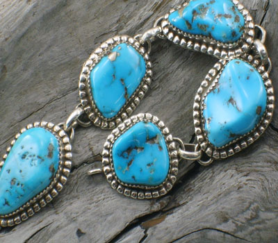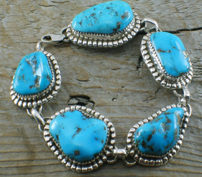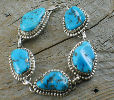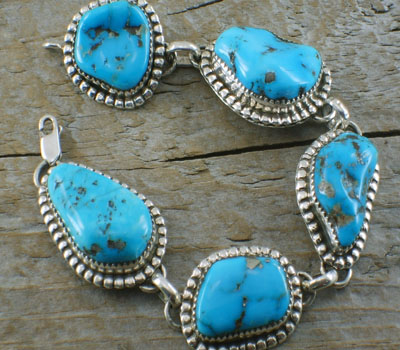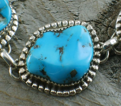 This turquoise link bracelet can only accurately be described as a stunningly beautiful jewelry piece! It is wonderful. It has five natural stones of Kingman (mine) turquoise, which was taken out of a private collection, and commissioned for use in this lovely bracelet. The silverwork comprising each bezel is superb, with its design possessing the quality to reflect light, accenting each turquoise stone. The Kingman turquoise is classic in hue, boasting deep and rich blues, with attractive matrix, even reaching "stormy" on a couple of stones. Blue turquoise such as this occurs as a result of the presence of copper in the earth (green-hued turquoise more a result of a higher iron content), and these natural, gem-quality turquoise stones possess that mesmerizing "opaque translucence" which captures your soul (yes, your soul!). Quality turquoise as this is becoming more rare, and therefore, more expensive. Owning heirloom-quality jewelry pieces of this caliber...is simply worth it.