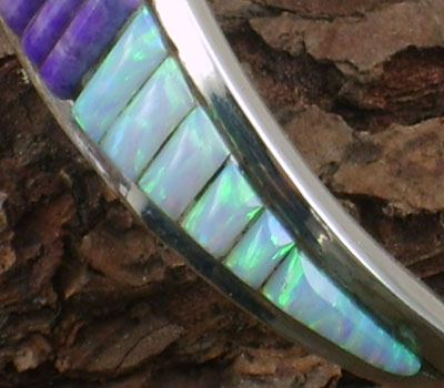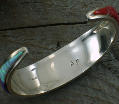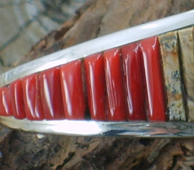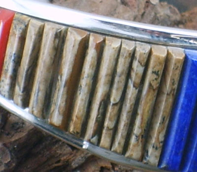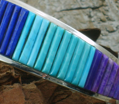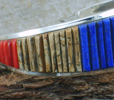 Unique American Indian made cuff having six individual sections of channel set stones; including red coral, picasso marble, lapis lazuli, turquiose, purple spiney oyster and lab opal. Truly a stunning and rare design destined to receive compliments every time worn. Stamped sterling and hallmarked AP.