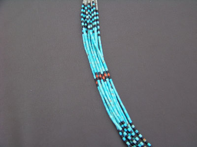 This is a classic design particular to Paul Tenorio, of Santo Domingo Pueblo. It is made of 10-strands of extremely fine heishi bead, combining bright blue turquoise, grey oyster shell, coral and jet. The design is incredibly eye-catching, and the skill involved in shaping these beads makes this feel like pure silk in you hands. We have matching earrings by the same artist within that category listing, if still available.