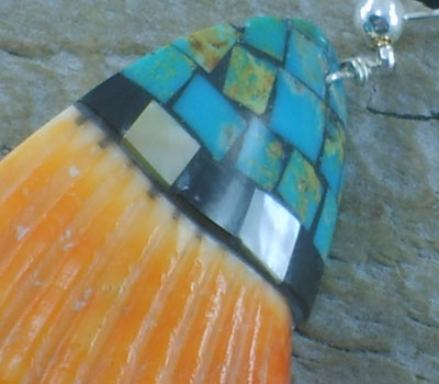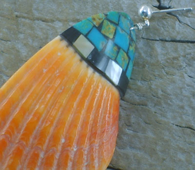 Native American orange spiney oyster shell Earrings having deeply defined grooves has been used as the palette for sea green turquoise inlay. Santo Domingo Indian made by artist Charlene Reano. Large and make a statement.