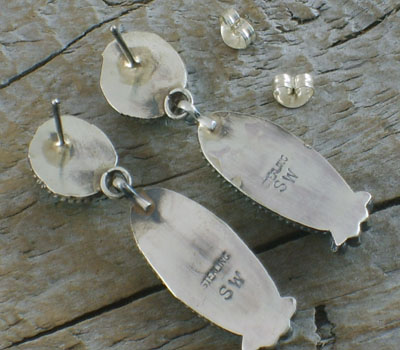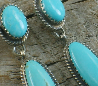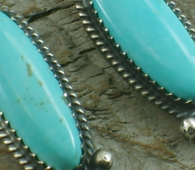 All turquoise stones presented here have a uniform aqua color which is true beauty. They are, indeed, "robin's egg" blue and are an excellent example of the turquoise gemstone. A lovely oval / long oval duet. You'll enjoy these. American Indian made.