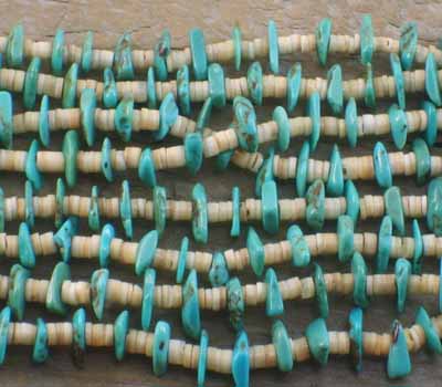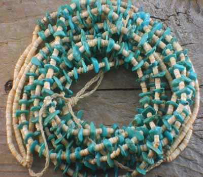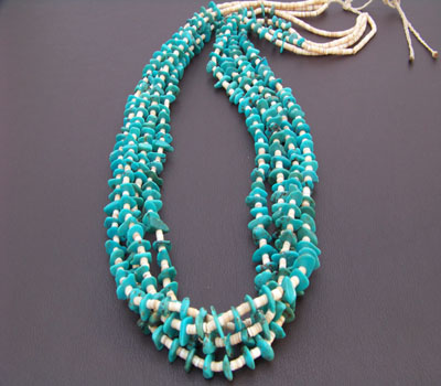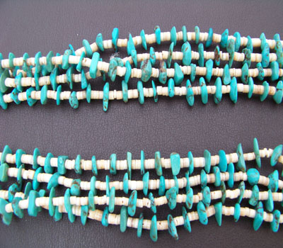This four strand turquoise nugget and melon shell is Santo Domingo Pueblo Indian made. It is a traditional Santo Domingo design, combining both stone and shell, and there is quite a bit of sky-blue turquoise on this one. It is strung on traditional braided waxed linen, which is loosely knotted in order to let the wearer adjust to the desired length. A very generous hang, and a very pretty necklace.