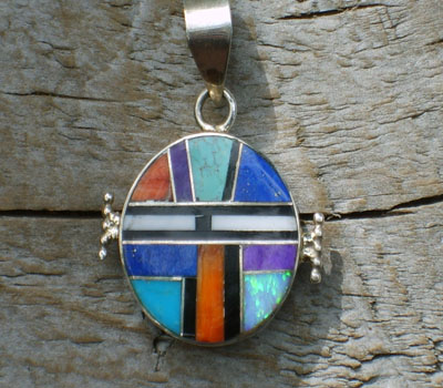 This Navajo-made pendant has two very distinctly designed sides. One side has fine inlay work of various stones, the other, very clean raised channel-work of picasso marble, red coral, blue and green turquoise, jet and white. It has a very generous bail, allowing it to be worn with a chain or perhaps a gemstone necklace.