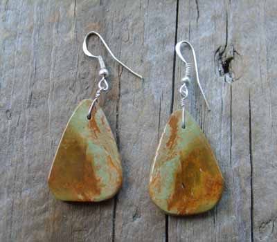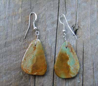 Turquoise slab earrings made by Native American artist . Teardrop in shape and sterling french ear wires complete the pair. These turquoise slab earrings possess a brown green earthy hue. Santo Domingo artist Jame Pete jr. The only pair we have with this mixture of hues