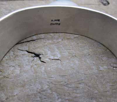 Stunning silver cuff by Albert Jake a Navajo artist. This is all natural turquoise and is justly surrounded by the master silversmithing of this Navajo artist. Each individual stamp and adornment is hand done by the artist, making this cuff bracelet a wearable piece of art. Stamped Sterling. Hallmarked A. Jake. A nice baby blue turquoise with gold matrix.