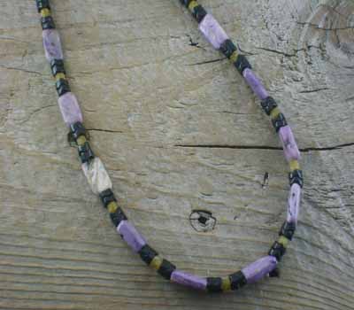 Made here at The Mine, we've joined high-quality charoite with rare jet snake beads. An interesting splash of green serpentine was used, also, which comes to life with the sunrise. A cool, casual piece.