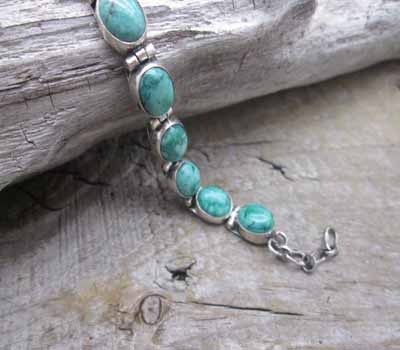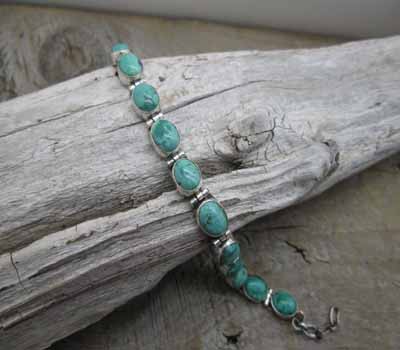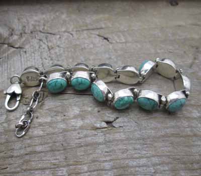 Happy Piasso Navajo lime turquoise link bracelet. A gorgeous blue-green lime turquoise with matrix resembling a shell of a tortoise. There are 14 individually set stones each with a unique look. The link design and heart lobster claw add to the appeal. A nice summer color. Stamped sterling. Hallmarked H.Piasso.