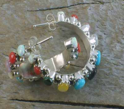 Native American handcrafted, lovely multi-stone hoop earrings. A nice sterling hoop with a wonderful assortment of semi-precious stones including; coral, pink mussel shell, MOP, turquoise, onyx, gold lip shell and man made opal. Very pretty.