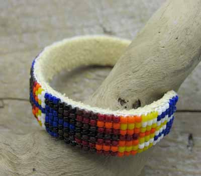 We acquired several of these American Indian beaded bracelets, each one having its own unique look, feel and appeal. No two are exactly alike. These are done with flexible metal within a soft sueded leather underside, giving adjustability in size and real comfort on the wrist. When we take our show on the road, these are usually the first items to go! The beadwork patterns are exceptional and we're proud to be able to offer a few.