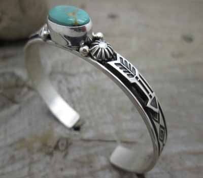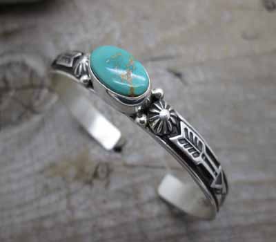 Sterling silver and Royston Turquoise cuff by Albert Jake. This is all natural Royston turquoise and is justly surrounded by the master silversmithing of each individual stamp and adornment hand done by this Navajo artist, making this cuff bracelet a wearable piece of art. Stamped Sterling. Hallmarked A. Jake.