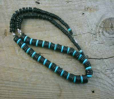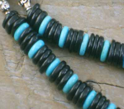 Graduating jet with blue turquoise are together, here! The jet beads are well-polished and individually shaped, with interspersed turquoise disc beads. Components are all sterling silver and contains raw Amazonite spacer beads.