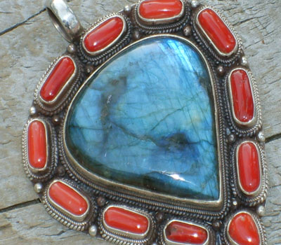 This is simply a one-of-kind labradorite pendant! When the light hits this beauty, the unearthly glow is just set afire on this stone. The natural matrix within makes this stone that much more beautiful. Mutually complementary to the center stone is the sheer brilliance of the red coral which surrounds it. Handcrafted in Nepal, where the artisanship is premier. No one you come in contact with will own a piece as this - but they will wish they did! Enjoy...