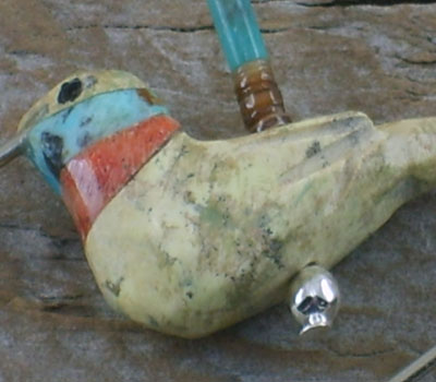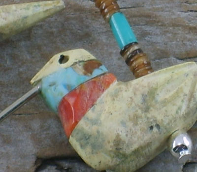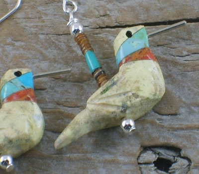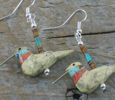 Hand-carved in the Great American Southwest, we have acquired a few very attractive pieces, using genuine gemstones, coral and sterling silver. They are eye-catching, fun to wear and quite lovely! Each jewelry piece is unique, having its own variations and character. They are made by craftsmen of the American southwest, but not necessarily of Native American Indian descent. Featured here is a hummingbird hand-carved with richolite (native to New Mexico), with coral and turquoise. The eyes have been drilled and all earring components are of sterling silver. Very fun to wear and a unique addition to your jewelry collection!