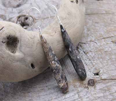 Turitella fossil earrings. Unique matrix and patterns in the rich cocoa brown color.Turitella is an agate, a variety of Chalcedony of the quartz family. It is recognized by the sea creature and fossilized snail patterns within the stone.