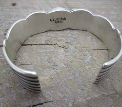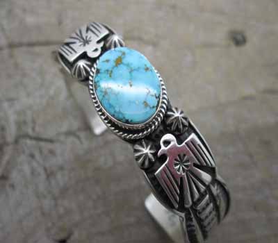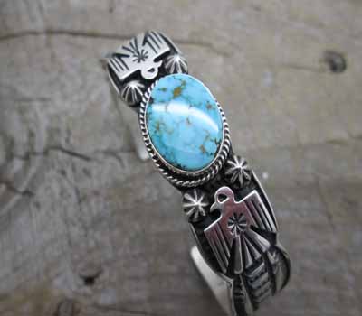 Lovely thunderbird silver cuff by Navajo artist Andy Cadman. This is all natural Pilot Mountain turquoise and is justly surrounded by the master silversmithing of the artist. Each individual stamp and adornment is hand done by this Navajo artist, making this cuff bracelet a wearable piece of art. Stamped Sterling. Hallmarked A. Cadman.