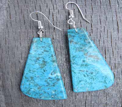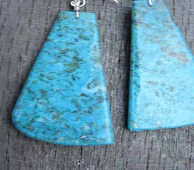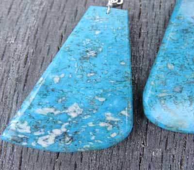Turquoise slab earrings. These are beautiful, large and stylish. The deep blue Kingman turquoise with dark swirl matrix make this pair of earrings very desirable. Finished with sterling french ear wires.Large slab earrings are hard to come by and we are fortunate to have acquired a few to offer. Handmade by Santo Domingo artist Lupe Lovato.