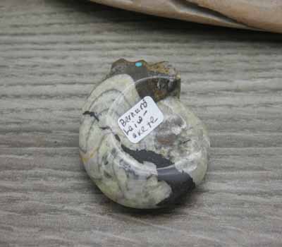Native American carved fetish. Zuni carved by Bernard- Laiwakete shaped and carved ammonite - shell fossil in the form of a curled bear.Turquoise eyes and wide snout makes him handsome, smooth to the touch.